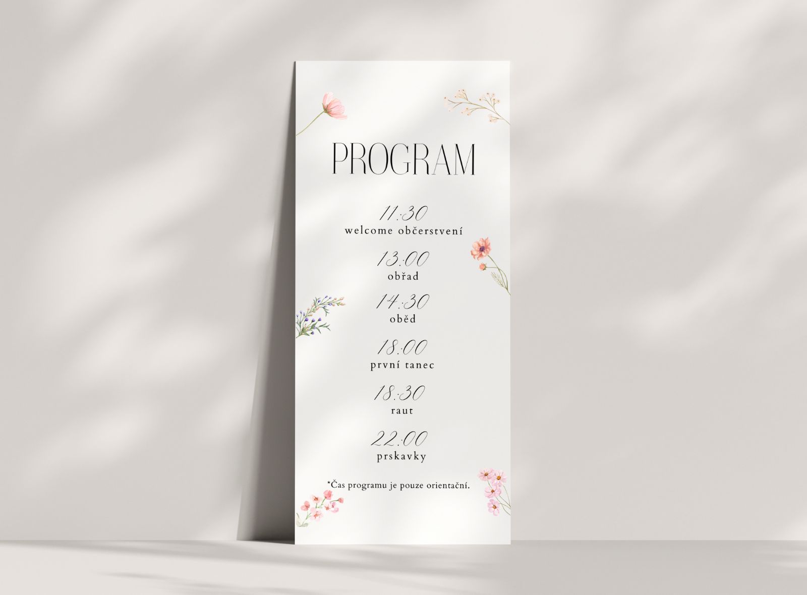 *Informace, které nám napíšete do poznámky k objednávce: časy a dané body programu. Můžete se nechat inspirovat našim vzorem na fotografiích produktu nebo také napsat vlastní informace, které potřebujete zahrnout do programu. V případě jakýchkoli dotazů neváhejte nás kontaktovat prostřednictvím mailu nebo na telefonním čísle +420 773 945 556.