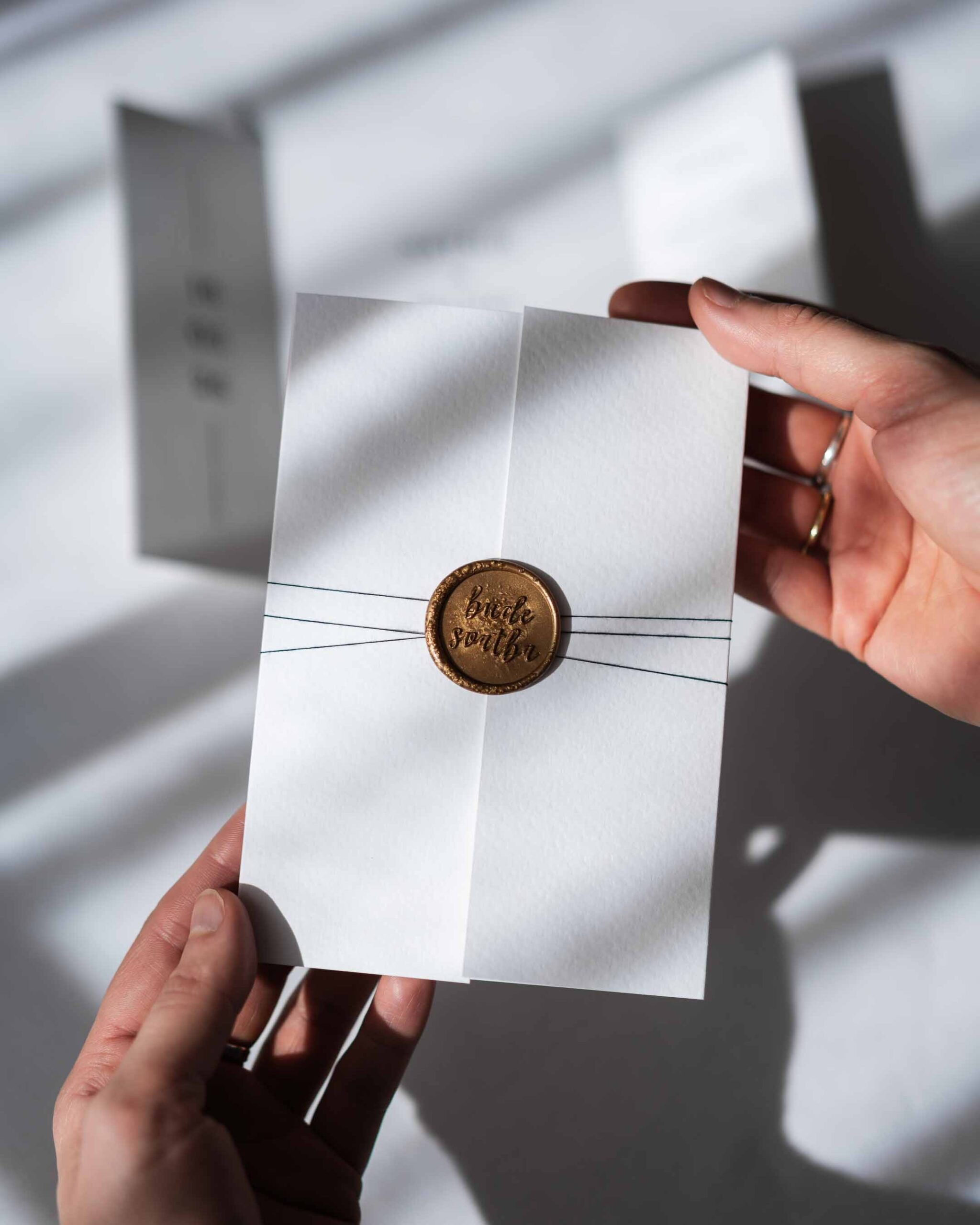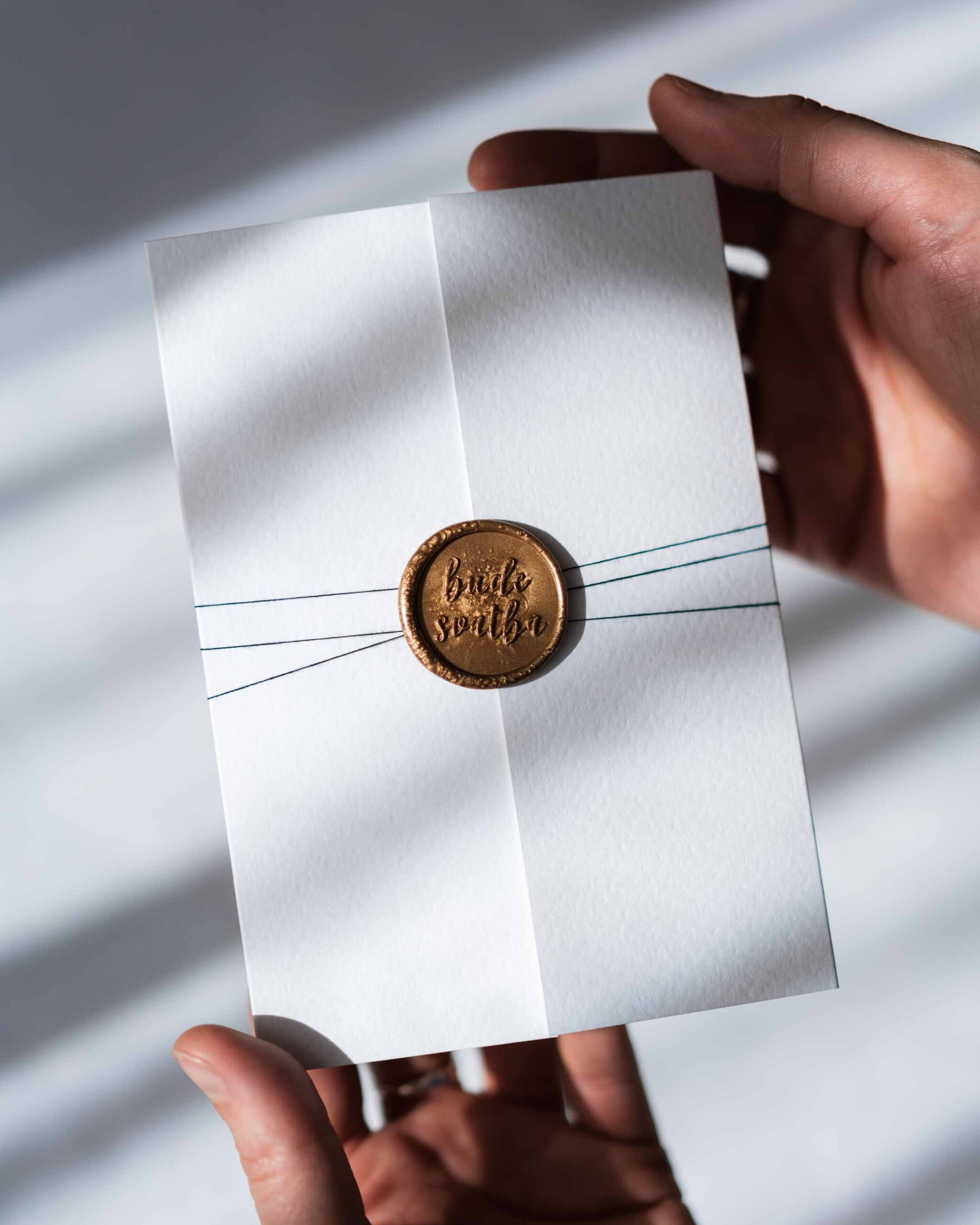 Kvalitní materiál: Svatební oznámení s pečetí Minimalism vyrábíme z prvotřídního strukturovaného papíru Modigliani o gramáži 260 g/m². Tento papír dodává oznámení elegantní strukturovaný vzhled a příjemný dotek. Zlatá pečeť má průměr 3 cm a je nalepená pouze na provázek, takže provázek s pečetí lehko sundáte z oznámení. Nabízíme více vzorů pečetě: bude svatba / budeme se brát / srdíčka / láska. Lze pečeť také udělat v jiné barvě, nabízíme zlatou, bílou, světle růžovou, zelenou metalickou, lze i zajistit jiný odstín. V případě, že byste měli zájem ještě o jiný odstín pečetě než je zlatá, napište nám požadavek do poznámky k objednávce, určitě to nějak vymyslíme.