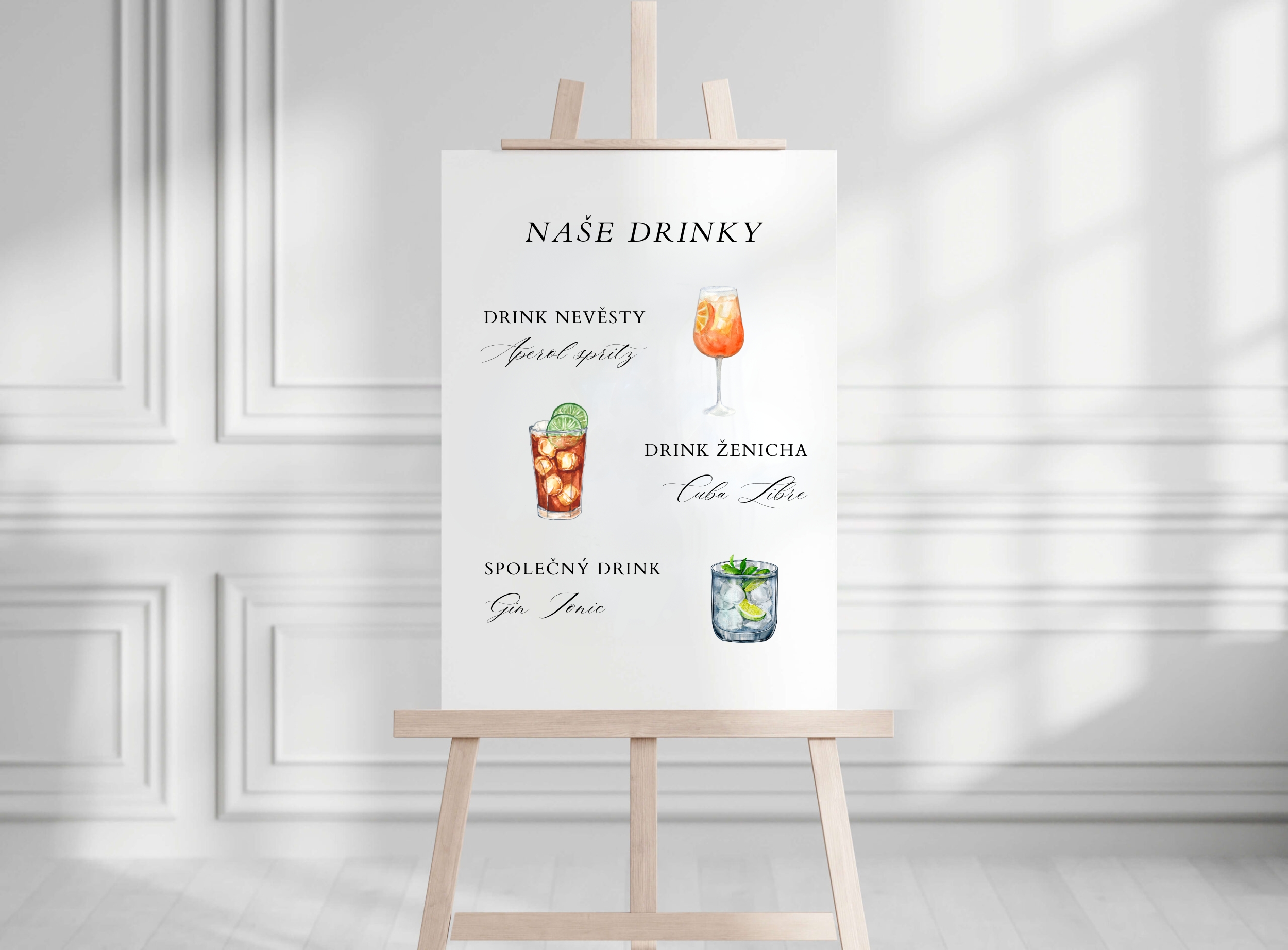 Dodejte svému svatebnímu baru osobní kouzlo. Tiskovina Naše drinky představí oblíbený drink nevěsty, ženicha i jejich společný koktejl – s ilustracemi ladící k vaší svatbě.