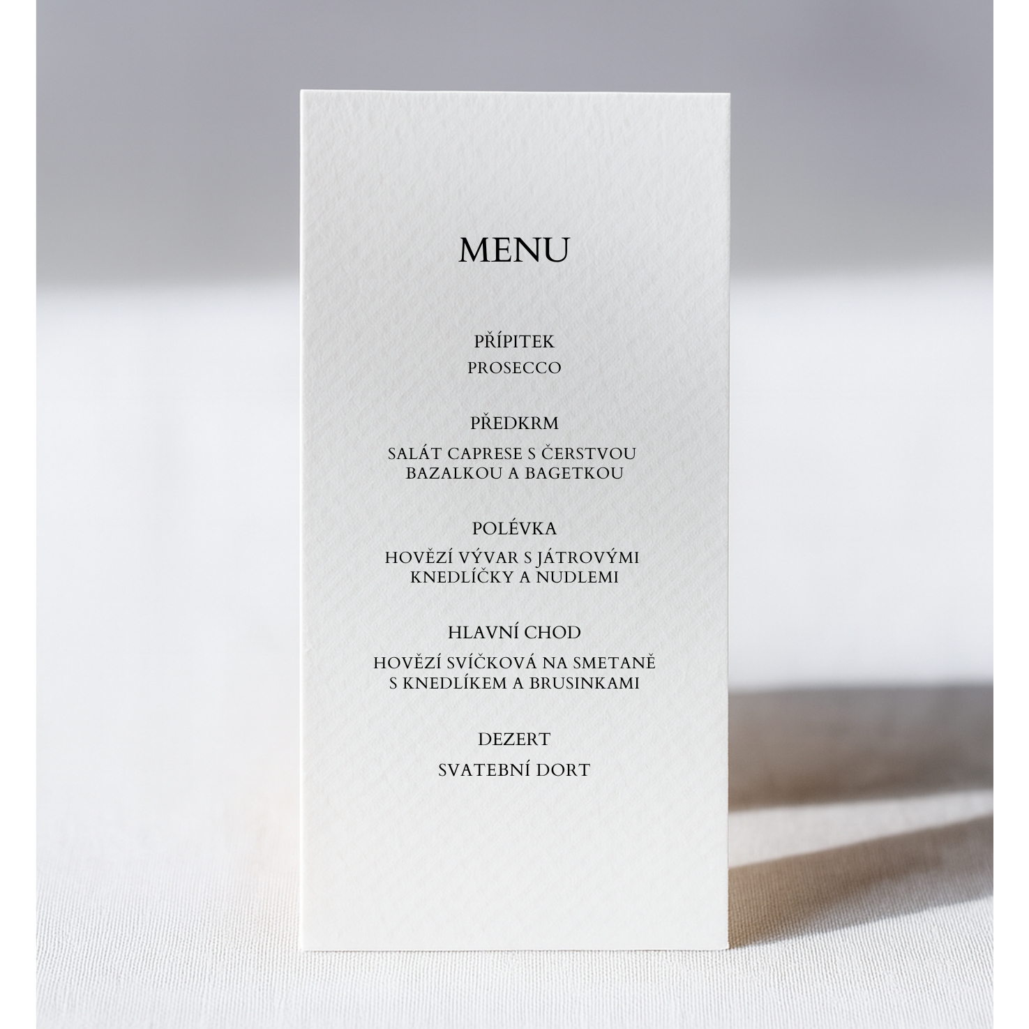 Kvalitní materiál: Jednoduché svatební menu Minimalism vyrábíme z prvotřídního strukturovaného papíru Modigliani o gramáži 260 g/m². Tento papír dodává menu elegantní strukturovaný vzhled a příjemný dotek.