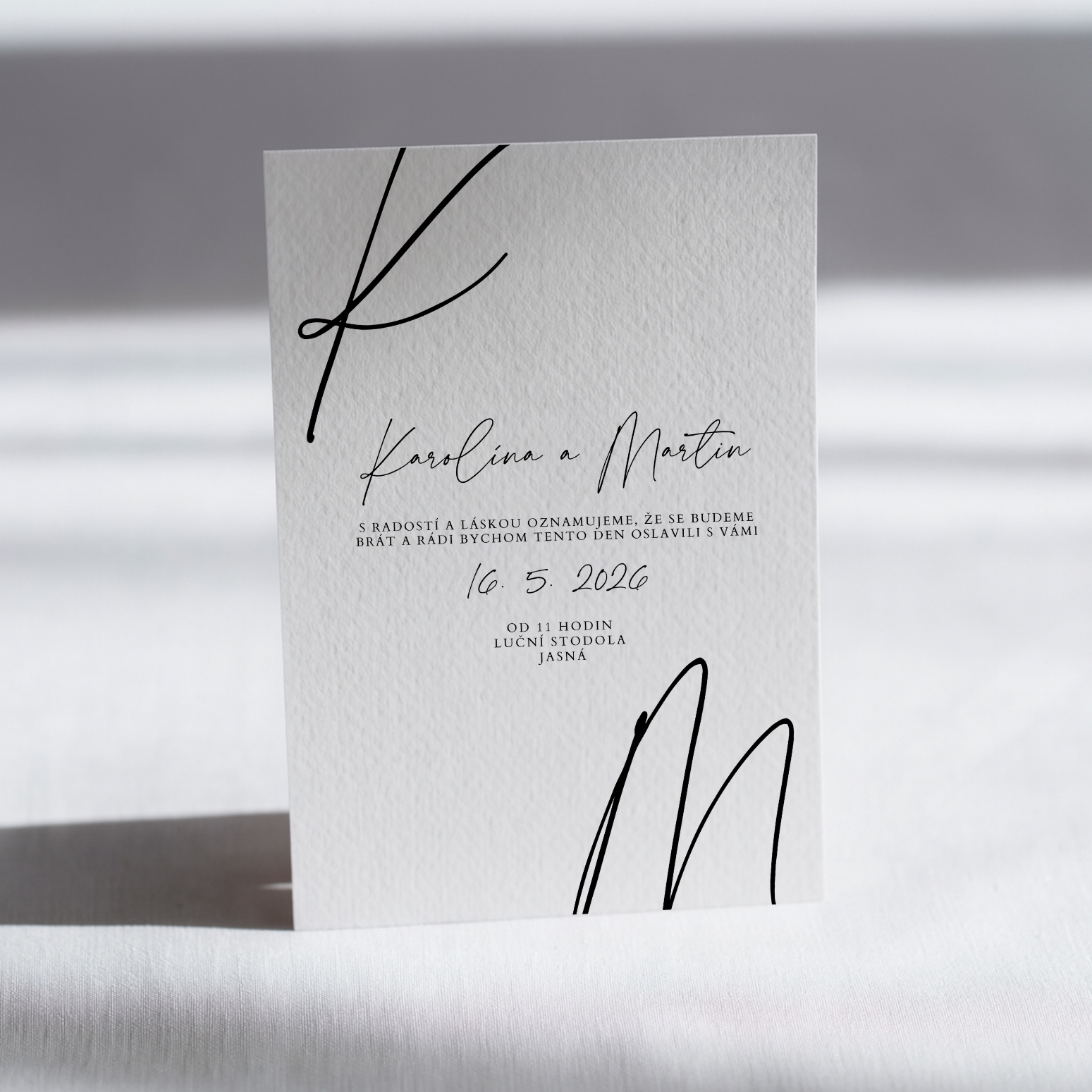 Svatební oznámení s iniciály má rozměry 10,5 x 14.85 cm (ideální pro obálky formátu C6).