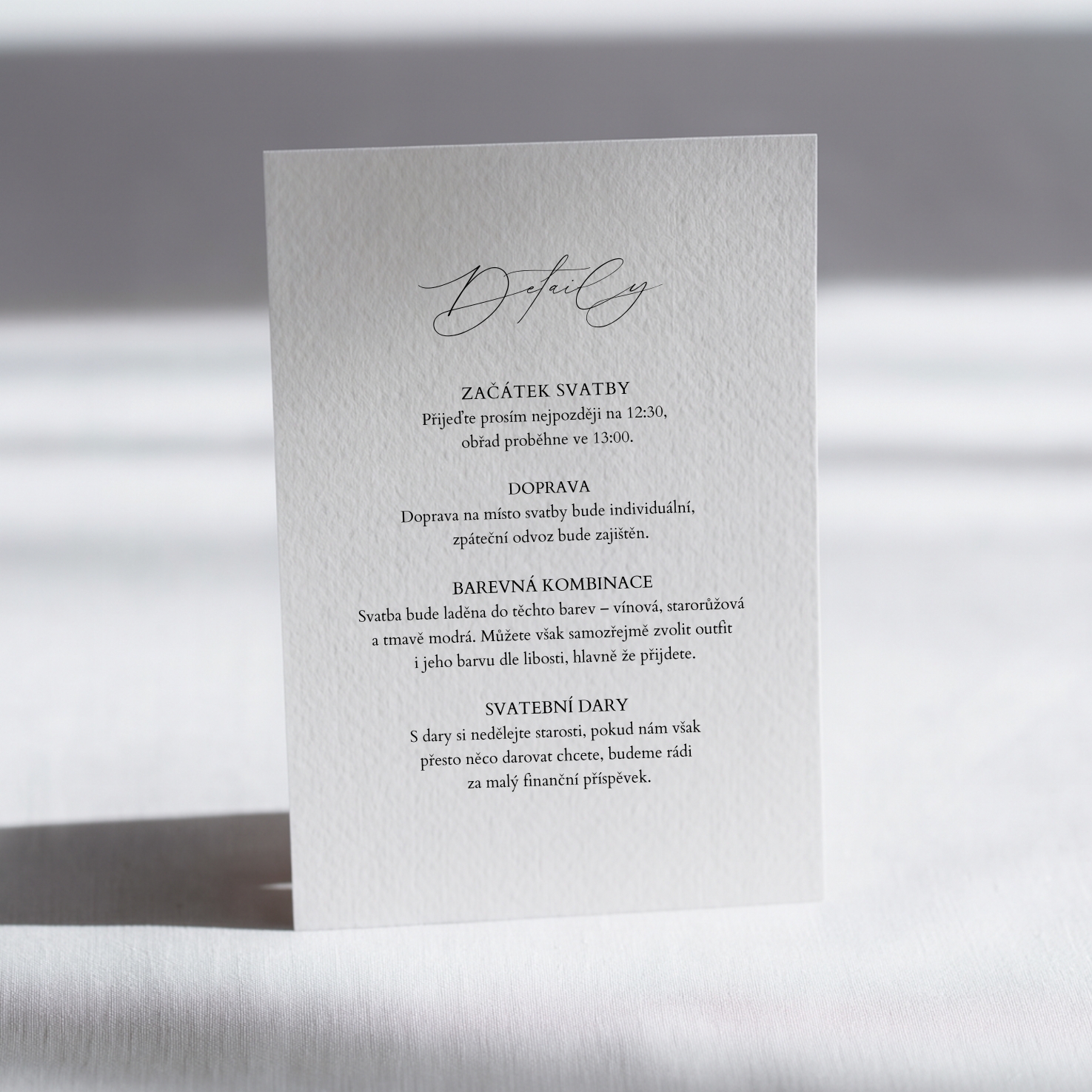 Kompletní svatební kolekce: Na našem e-shopu najdete také další produkty ve stylu svatební kolekce Laila, jako jsou jmenovky, uvítací tabule, menu, program, čísla stolů, zasedací pořádek a mnoho dalšího. Všechny tyto doplňky můžete sladit s vaším svatebním oznámením, aby vaše svatba byla dokonale harmonická.