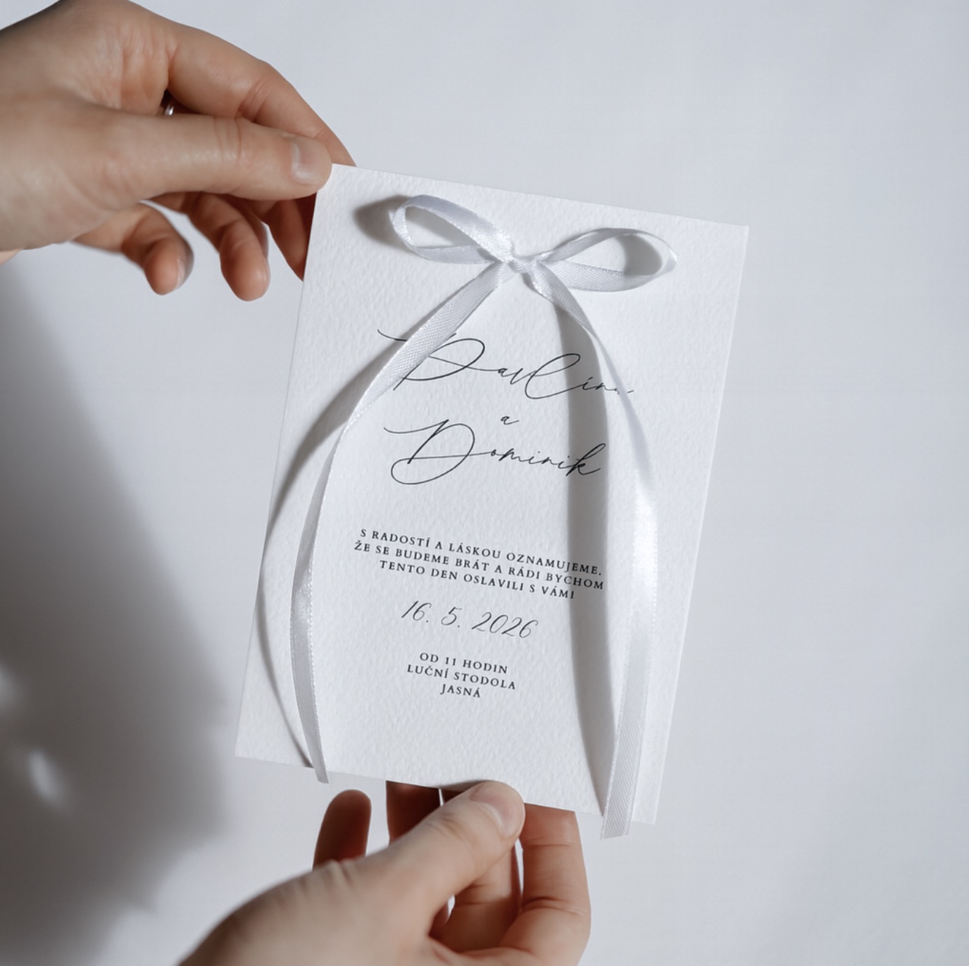 Kvalitní materiál: Svatební oznámení se stuhou Laila vyrábíme z prvotřídního strukturovaného papíru Modigliani o gramáži 260 g/m². Tento papír dodává oznámení elegantní strukturovaný vzhled a příjemný dotek.