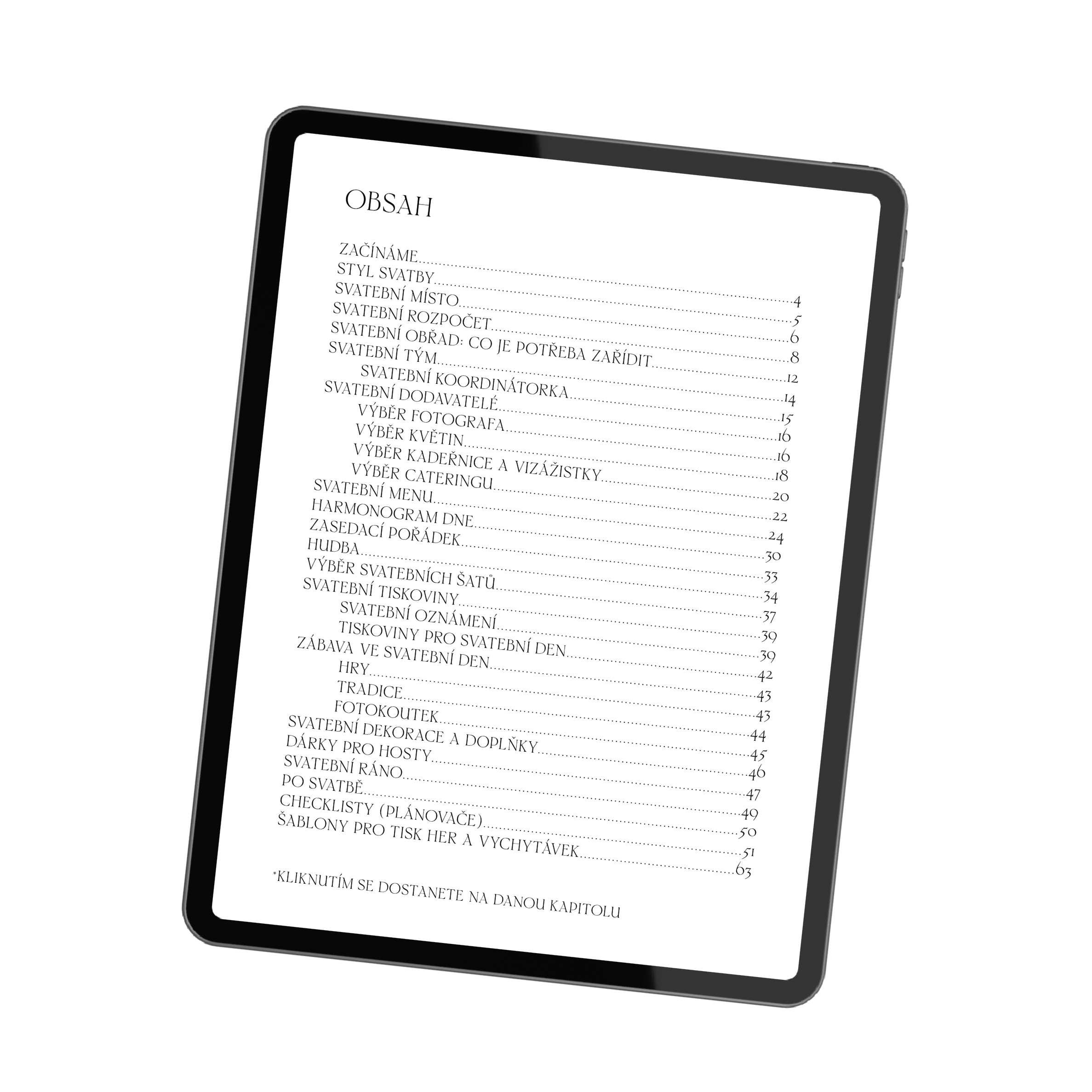 Plánujete svatbu a nechcete se ztratit v hromadě poznámek, papírků a otevřených záložek? Tento svatební plánovač a průvodce ve formátu PDF vás provede celým procesem od prvních příprav až po chvíle po svatbě.