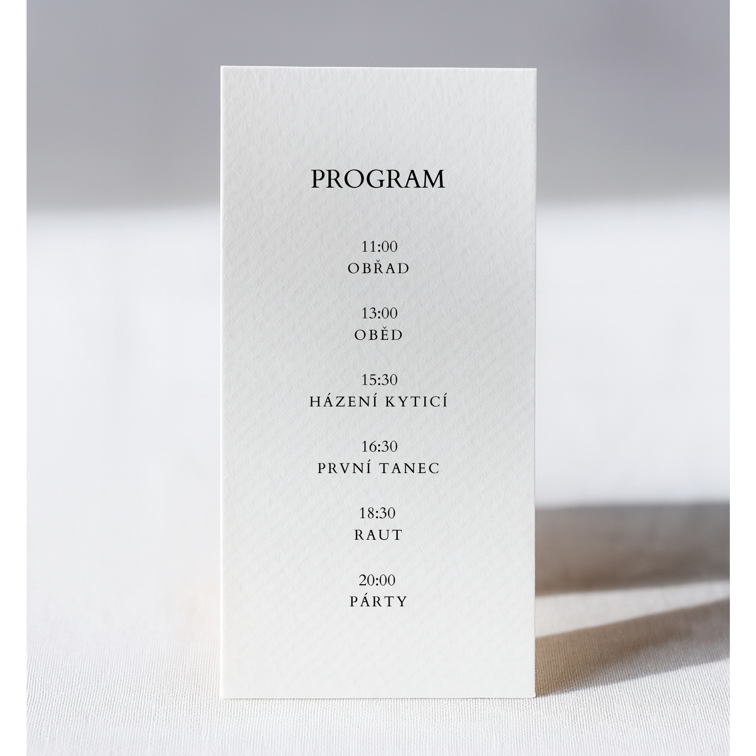 *Informace, které nám napíšete do poznámky k objednávce: časy a dané body programu. Můžete se nechat inspirovat našim vzorem na fotografiích produktu nebo také napsat vlastní informace, které potřebujete zahrnout do programu. V případě jakýchkoli dotazů neváhejte nás kontaktovat prostřednictvím mailu nebo na telefonním čísle +420 773 945 556.