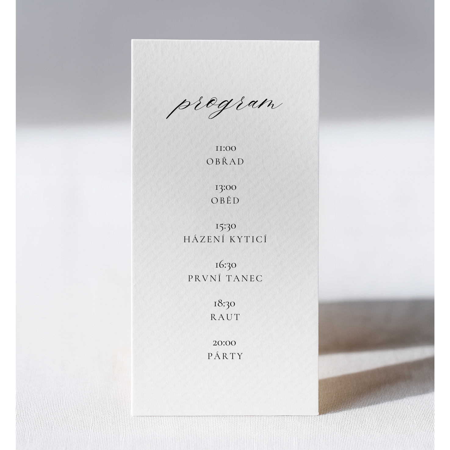 *Informace, které nám napíšete do poznámky k objednávce: časy a dané body programu. Můžete se nechat inspirovat našim vzorem na fotografiích produktu nebo také napsat vlastní informace, které potřebujete zahrnout do programu. V případě jakýchkoli dotazů neváhejte nás kontaktovat prostřednictvím mailu nebo na telefonním čísle +420 773 945 556.
