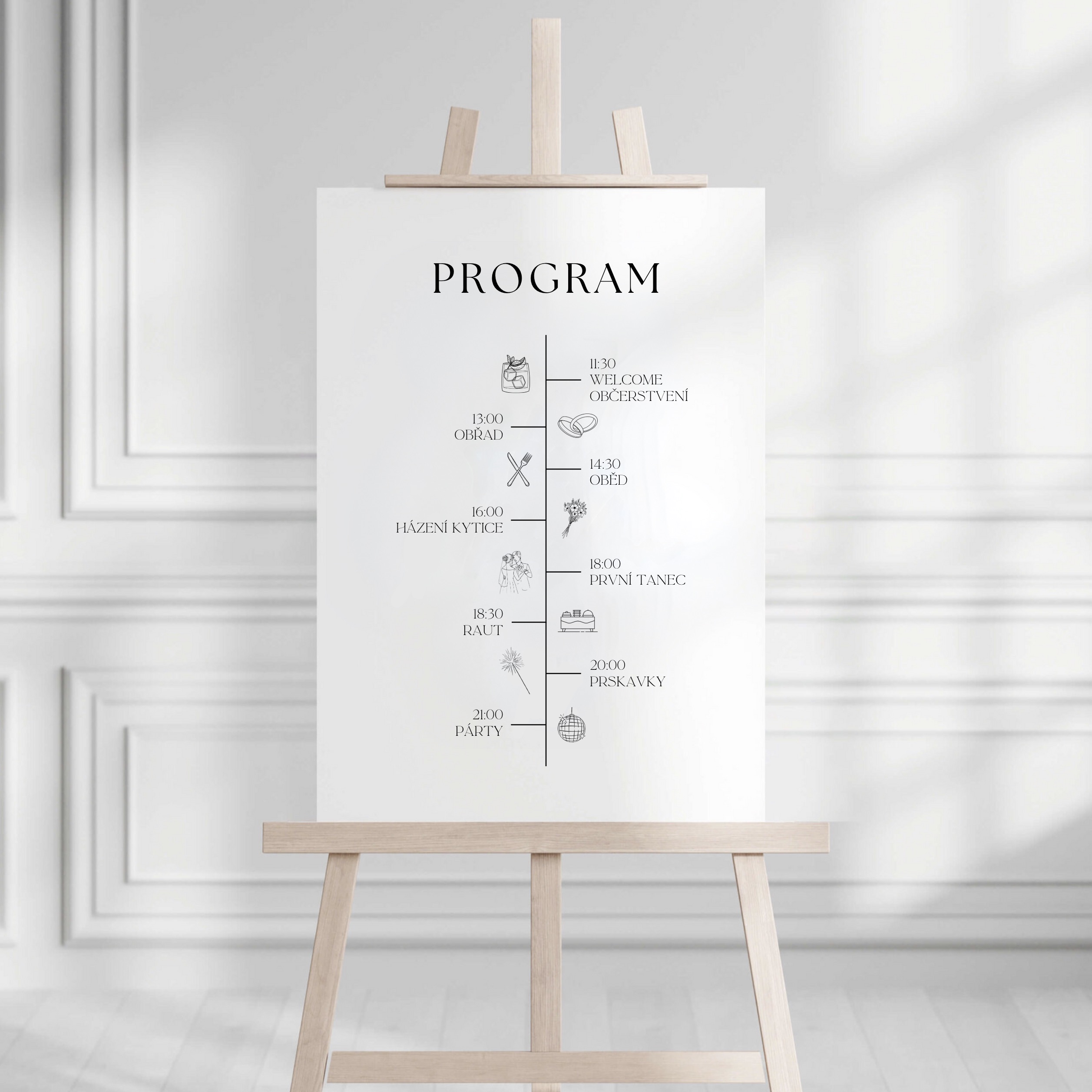*Informace, které nám napíšete do poznámky k objednávce: časy a dané body programu. Můžete se nechat inspirovat našim vzorem na fotografiích produktu nebo také napsat vlastní informace, které potřebujete zahrnout do programu. V případě jakýchkoli dotazů neváhejte nás kontaktovat prostřednictvím mailu nebo na telefonním čísle +420 773 945 556.