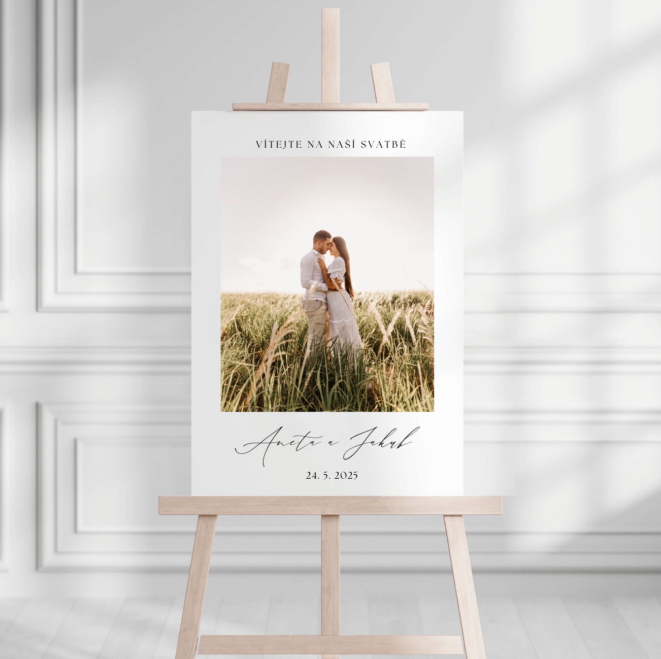 Elegantní svatební uvítací tabule s fotografií má rozměry A2 nebo A3.