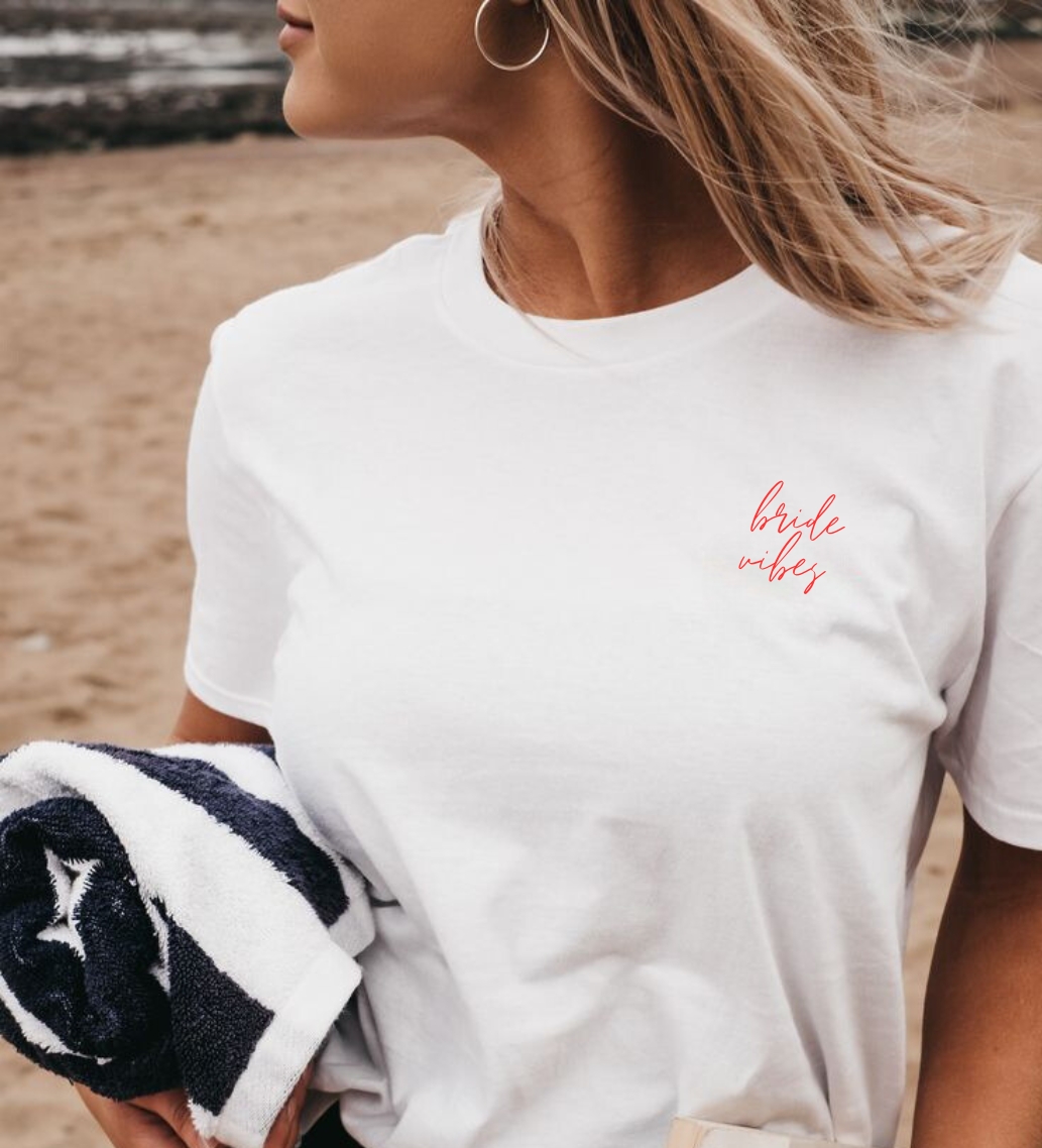 Plánujete rozlučku se svobodou a hledáte vhodný prvek pro nevěstu? Toto tričko pro nevěstu na rozlučku se svobodou je ideálním doplňkem, když hledáte něco hravého a barevného. Bílé tričko má na přední straně červený nápis BRIDE VIBES.